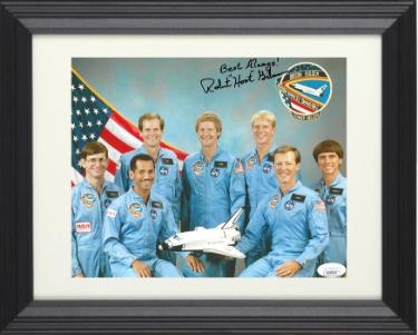 Robert "Hoot" Gibson is a former American naval officer and aviator, test pilot, aeronautical engineer, and a retired NASA astronaut, as well as a professional pilot.  In five space flights, Gibson completed a total of 36.5 days in space.  Robert "Hoot" Gibson has hand signed this 8x10 Photo with Best Always! inscription.  New, Custom Black Frame with White Mat. JSA Hologram #DD64522 and Certificate of Authenticity.