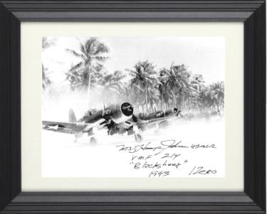 In August, 1943, a group of twenty-seven young men under the leadership of Maj. Gregory “Pappy” Boyington was joined together to form the original Black Sheep Sqn. of VMF-214. The Black Sheep produced eight fighter Aces flying against the Japanese, and the Sqn earned the Presidential Unit Citation for extraordinary heroism in action. Major Harry Johnson has hand signed this 1943 Boyington's Black Sheep B&W Vintage 8x10 with VMF 214 Blacksheep 1943 inscription. New, Custom Black Frame with White Mat.  JSA Authentication Sticker #JJ96484 & Certificate of Authenticity