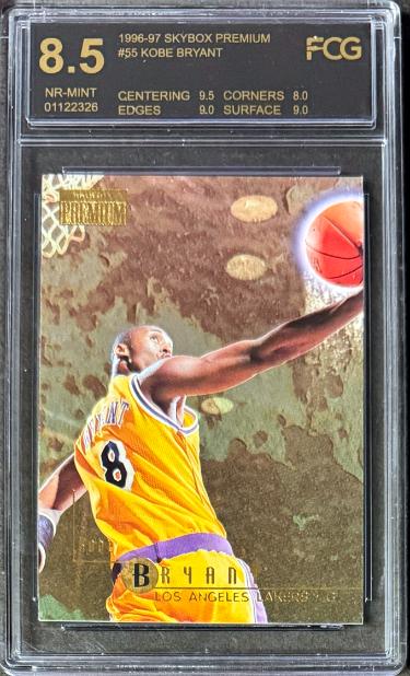This is a Kobe Bryant 1996-97 Skybox Premium Rookie Card (RC) #55- FCG Graded 8.5 NM (Los Angeles Lakers/HOF/with Sub Grades) Image of actual item in stock - as shown