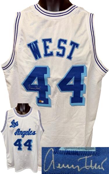 This is a new, in stock, Jerry West signed Los Angeles White Throwback Unlicensed Custom Stitched Pro Style Basketball Jersey with fully stitched twill numbers on the front and back, there are NO LICENSED TEAM LOGOS, TAGS, BRAND NAMES or PATCHES ON THIS JERSEY & IS NOT AN AUTHENTIC OFFICIALLY LICENSED JERSEY, 100% polyester, made in the Philippines. Size L (44/46) Bold Silver Full Signature.