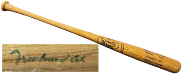 Muhammad Ali was an American professional boxer and social activist. A global cultural icon, widely known by the epithet "The Greatest", he is frequently cited as the greatest heavyweight boxer of all time. He held the Ring magazine heavyweight title from 1964 to 1970, was the undisputed champion from 1974 to 1978, and was the WBA and Ring heavyweight champion from 1978 to 1979. In 1999, he was named Sportsman of the Century by Sports Illustrated and the Sports Personality of the Century by the BBC. Some fight fans call him the original Louisville Slugger and some just call him the Greatest, but by any name Muhammad Ali was the greatest heavyweight champion of his time – and by some estimations – of all time. This is an official Louisville Slugger Pro Model Bat autographed by former Heavyweight Boxing Champion Muhammad Ali. This unique collectible would make a tremendous addition to any collection and could become the most talked about piece on display in your home or office. Muhammad Ali has hand signed this Louisville Slugger 125, Genuine Model P72 Blonde - Greatest Of All Time - Name Engraved Bat. Limited Edition #91 of 94. Light green full on barrel signature, left of engraved area, sold as is. Beckett Authentication Signature Review Order ID #97153 and Review Order Item ID #117161. Image of actual item in stock - as shown