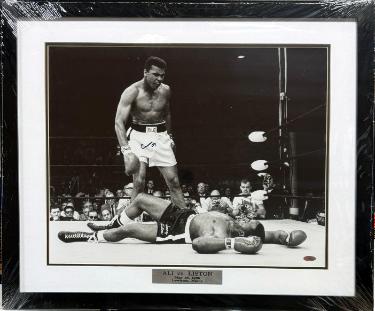 Muhammad Ali, born Cassius Clay was an American professional boxer and social activist. A global cultural icon, widely known by the epithet "The Greatest", he is frequently cited as the greatest heavyweight boxer of all time. He held the Ring magazine heavyweight title from 1964 to 1970, was the undisputed champion from 1974 to 1978, and was the WBA and Ring heavyweight champion from 1978 to 1979. In 1999, he was named Sportsman of the Century by Sports Illustrated. Muhammad Ali Signed Cassius Clay has hand signed this 1965 16x20 Photo vs Sonny Liston in 1965. Amazing Bold blue full pristine signature. New, Custom Matted & Framed with Ali vs Liston 1965 Nameplate. Steiner Sports Hologram and Steiner Certificate of Authenticity. Image of actual item in stock - as shown