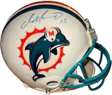 Dan Marino became one of the most prolific quarterbacks in league history, holding or having held almost every major NFL passing record. Despite never being on a Super Bowl-winning team, he is recognized as one of the greatest quarterbacks in American football history. Remembered particularly for having a quick release and a powerful arm, Marino led the Dolphins into the playoffs on numerous occasions. Marino was inducted into the Football Hall of Fame in 2005. Dan Marino has hand signed this Miami Dolphins Riddell NFL Full Size Authentic Proline Helmet. Light, Blue full signature with #13 inscription, sold as is. Steiner Sports & Mounted Memories & Dan Marino Players Holograms & Athlon Sports Collectibles Certificate of Authenticity.