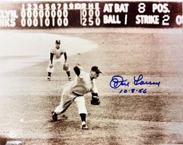 Don Larsen's most notable accomplishment was pitching the only perfect game (as well as the only no hitter) in the history of the World Series, and one of only 18 perfect games overall. He was pitching for the New York Yankees in Game 5 of the 1956 World Series against the Brooklyn Dodgers, on October 8, 1956. His perfect game remains the only no-hitter of any type ever pitched in postseason play. Don Larsen has hand signed this New York Yankees Perfect Game 8x10 Photo. Bold Blue Pristine Signature with 10-8-56 inscription. Minor dings/imperfections, sold as is