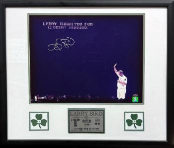 Larry Bird is widely regarded as one of the greatest basketball players of all time. He is the only person in NBA history to be named Rookie of the Year, Most Valuable Player, Finals MVP, All-Star MVP, Coach of the Year, and Executive of the Year. Larry Bird has hand signed this Boston Celtics NBA Licensed 16x20 Photo Thank You for 13 Great Seasons. Bold full pristine signature - Custom Matted and Framed to Overall Size 26.5x30.5. Framed with Celtics #33 Logos & Nameplate. Limited Edition #13 of 33. Steiner Sports Hologram & Steiner Certificate of Authenticity.
