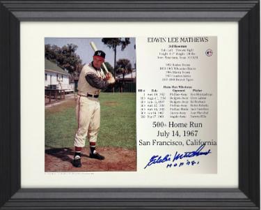 Edwin Lee Mathews was an American professional baseball third baseman. He played in Major League Baseball for 17 seasons for the Boston / Milwaukee / Atlanta Braves (1952–1966); Houston Astros (1967) and Detroit Tigers (1967–68). Inducted into the National Baseball Hall of Fame in 1978, he is the only player to have represented the Braves in the three cities they have called home. He was an All-Star for nine seasons. He won the National League (NL) home run title in 1953 and 1959 and was the NL Most Valuable Player runner-up both of those seasons. He hit 512 home runs during his major league career. Eddie Mathews has hand signed this Milwaukee Braves MLB Licensed 500th Home Run July 14, 1967 8x10 Photo/Card. Bold Blue Full Pristine Signature with HOF 78 inscription. Minor wear from signing, sold as is. New, Custom Black Frame with White Mat. Athlon Sports Collectibles Certificate of Authenticity and Collector's Showcase Show Ticket. Image of actual item in stock - as shown