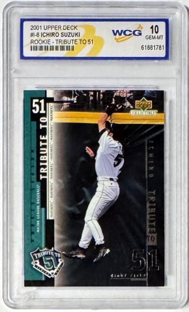 This is an Ichiro Suzuki 2001 Upper Deck Rookie Tribute to 51 Card #I-8- WCG Graded 10 Gem Mint (Seattle Mariners/HOF). Image of actual item in stock - as shown