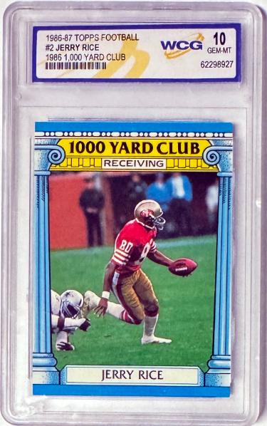 This is a Jerry Rice 1986-87 Topps 1,000 Yard Club Card #2- WCG Graded 10 Gem Mint (San Francisco 49ers/HOF). Image of actual item in stock - as shown