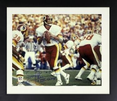 Joe Theismann led the Redskins to a win in Super Bowl XVII and an appearance in Super Bowl XVIII and would go on to set several Redskins franchise records, including most career passing attempts (3,602), most career passing completions (2,044) and most career passing yards (25,206), while also throwing 160 touchdown passes. He was the NFL's MVP in 1983. Joe Theismann has hand autographed this Washington Redskins NFL Licensed 16x20 Photo with SBXVII Champs inscription. New, Custom Black Frame with White Mat. Certificate of Authenticity from Athlon Sports.